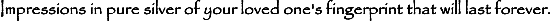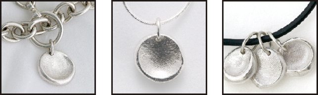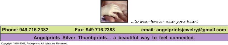Angelprints Silver Thumbprint pendants are made from an imprint of your own actual thumbprint or fingerprint impression taken in clay or wax. From that original impression, I make a piece of jewelry that is as individual and unique as your own thumbprint. Your Silver Thumbprint necklace will become a beloved and treasured family heirloom. Your Thumbprint pendant carries the energy and love of the person whose imprint you are wearing. It is a beautiful way to stay connected to those you love, whether it be your child, your grandchild, your mother, your best friend, your lover or your pet. A Silver Thumbprint pendant keeps you connected in a wonderful way as you wear it close to your heart. A Silver Thumbprint necklace is the perfect gift for a mother, a grandmother, a best friend, a lover, a spouse, a fiancé. A Silver Thumbprint Necklace is a fabulous gift for an expectant Mother. It is a wonderful gift to exchange between a mother and daughter. Children love the idea of wearing their mother's thumbprint when they are at school. We can also take the imprint of your beloved cat or dog. The Thumbprint pendants can be made in pure silver or sterling silver, 14kt, 18kt, 22kt Gold, Platinum, and are available with diamonds.
